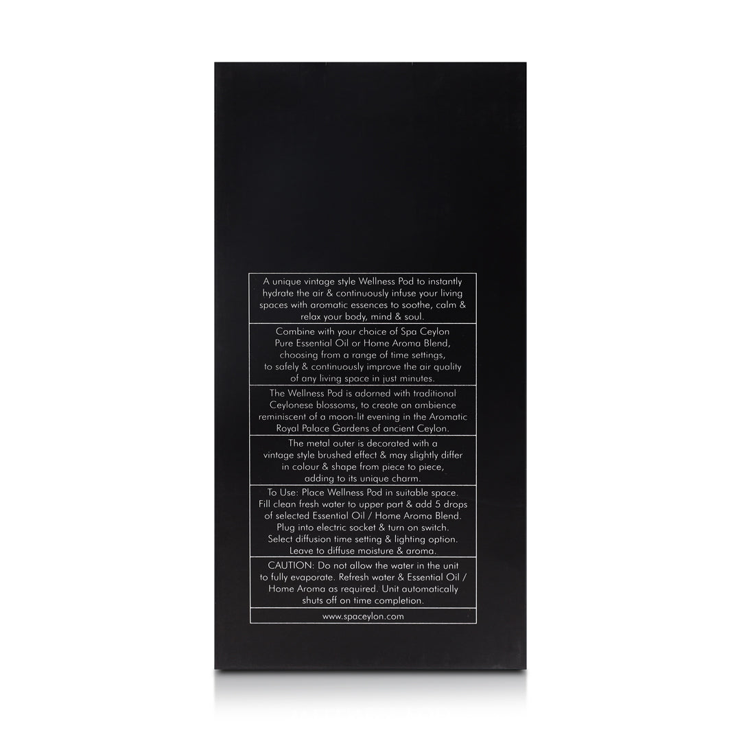 Detailed DescriptionA unique vintage style Wellness Pod to instantly hydrate the air & continuously infuse your living spaces with aromatic essences to soothe, calm & relax your body, mind & soul.
