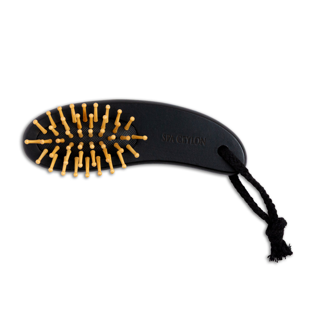 Compact & travel-friendly hairbrush with rounded wooden bristles for gentle detangling. Helps reduce static & massage the scalp for healthy-looking hair anytime, anywhere.