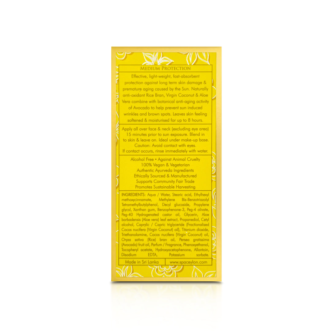 Effective, light-weight, fast-absorbent protection against long term skin damage & premature aging caused by the Sun. Naturally anti-oxidant Rice Bran, Virgin Coconut & Aloe Vera combine with botanical anti-aging activity of Avocado to help prevent sun induced wrinkles and brown spots. Leaves skin feeling softened & moisturised for up to 8 hours.