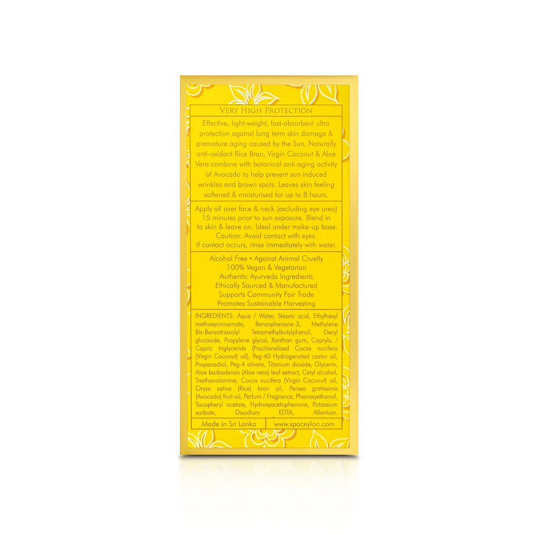 Effective, light-weight, fast-absorbent ultra protection against long term skin damage & premature aging caused by the Sun. Naturally anti-oxidant Rice Bran, Virgin Coconut & Aloe Vera combine with botanical anti-aging activity of Avocado to help prevent sun induced wrinkles and brown spots. Leaves skin feeling softened & Moisturised for up to 8 hours.